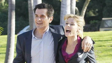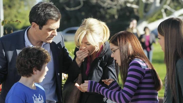 It's Election Day for Claire for the town council. Everybody is pulling out all the stops. Phil is even videotaping the entire day, because he knew twenty years ago when Claire was a young, budding...never mind. Mitchell and Cameron are going all out for Claire; they even put placards and a giant speaker on their car and are driving around the neighborhood. Although their catchphrases need some work, like "we're here, we're Claire, get used to it!", it works really well in shaming a litterbug into picking up his trash or a "dragon tattoo" girl to not jaywalk. Speaking of Jay, he's proud to bring Gloria and Manny down to vote, only he turns around right away. Still, that beats the reporter who asked Claire whom she was voting for in the election. And suddenly she's lacking a bit of confidence.