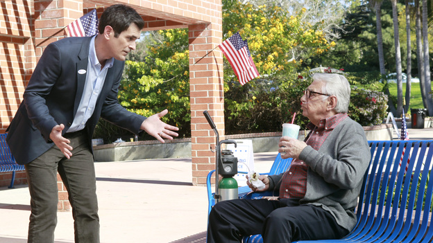 Meanwhile, Cam and Mitch have let the speaker on their car go to their head, commenting wherever and whenever they felt like it. They had quite a few axes to grind and a hybrid car while Phil tried to bring a group of senior citizens to the polls beginning with their neighbor, Walt. That went over well, particularly when Walt's oxygen ran out and Phil wouldn't take him, as did Mitch and Cam accidentally revealing to Lily's school teacher that her fiance was really gay.