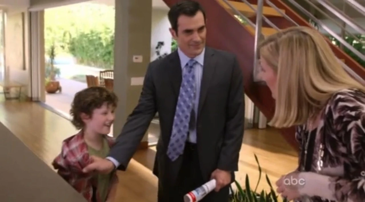 It's evident that Phil actually finds Jays' playfull grabbing and hitting really really painful, but he laughs each one off, but tells Phil "That's a good grip" on the last one, while Mitchell awkwardly watches what Jay is doing to his brother-in-law. Phil then whispers to Claire: "Can we switch seats?". Mitchell tells Cameron that people are staring at him being the only Uncle there who is recording everything in a 'being-difficult' way and Jay tells Phil that he knows he's not supposed to care but "it's kind of cool to have a kid in your house who's the best at something." and Jay asks Phil if he knows what he means.