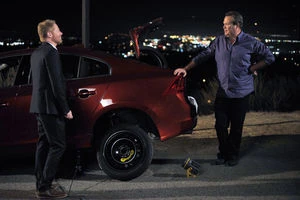 They have plenty of time to set up, however, as Mitch and Cam get a flat tire. (On Mulholland Drive on a starry night, no less). Mitch was actually quite proud of how well he can change a tire these days...and let the flat one fall down the hill and hit someone's house. They go to put on the spare and realize both of them are down on one knee. They look at each other and both say yes.